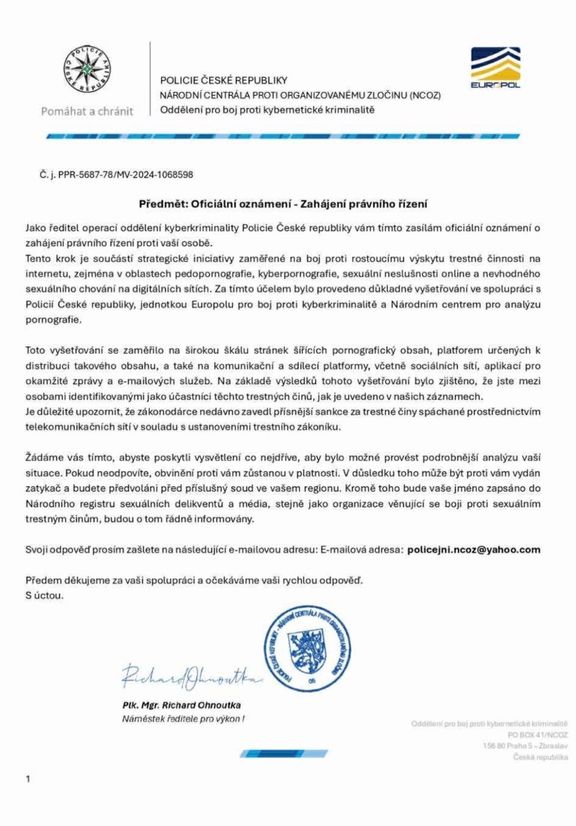 V příloze podvodného e-mailu pak bývá "oficiálně" znějící dopis, často na falešném hlavičkovém papíře a s nesprávnou terminologií. Objevuje se v něm mimo jiné i formulace: "Jako ředitel operací oddělení kyberkriminality Policie České republiky vám tímto zasílám oficiální oznámení o zahájení právního řízení proti vaší osobě," což má adresáta vyděsit a přesvědčit, že je proti němu vedeno řízení.