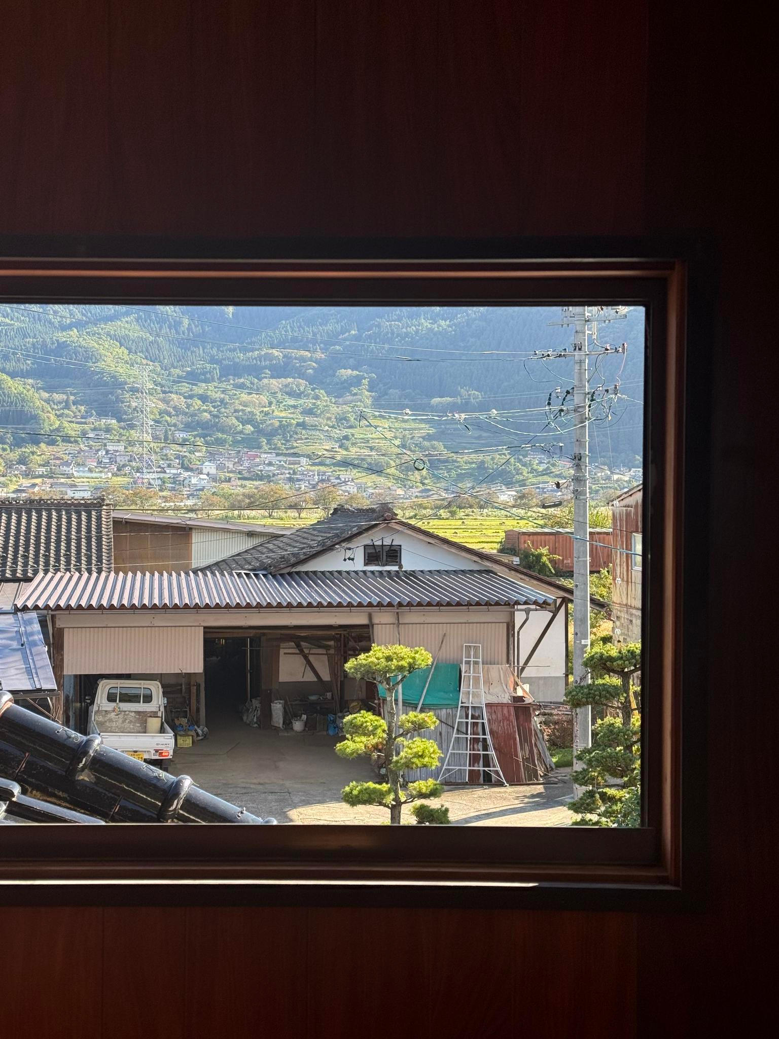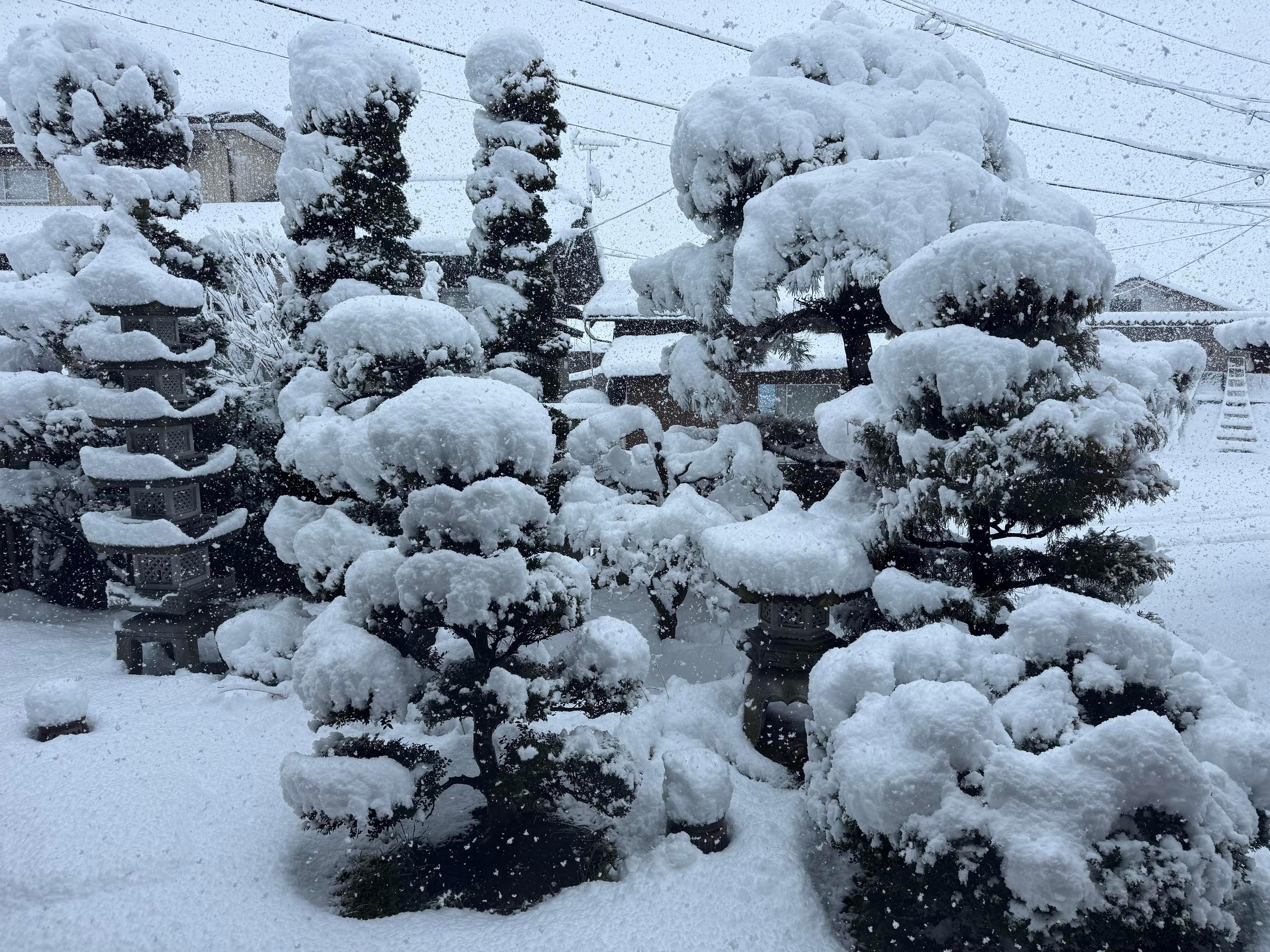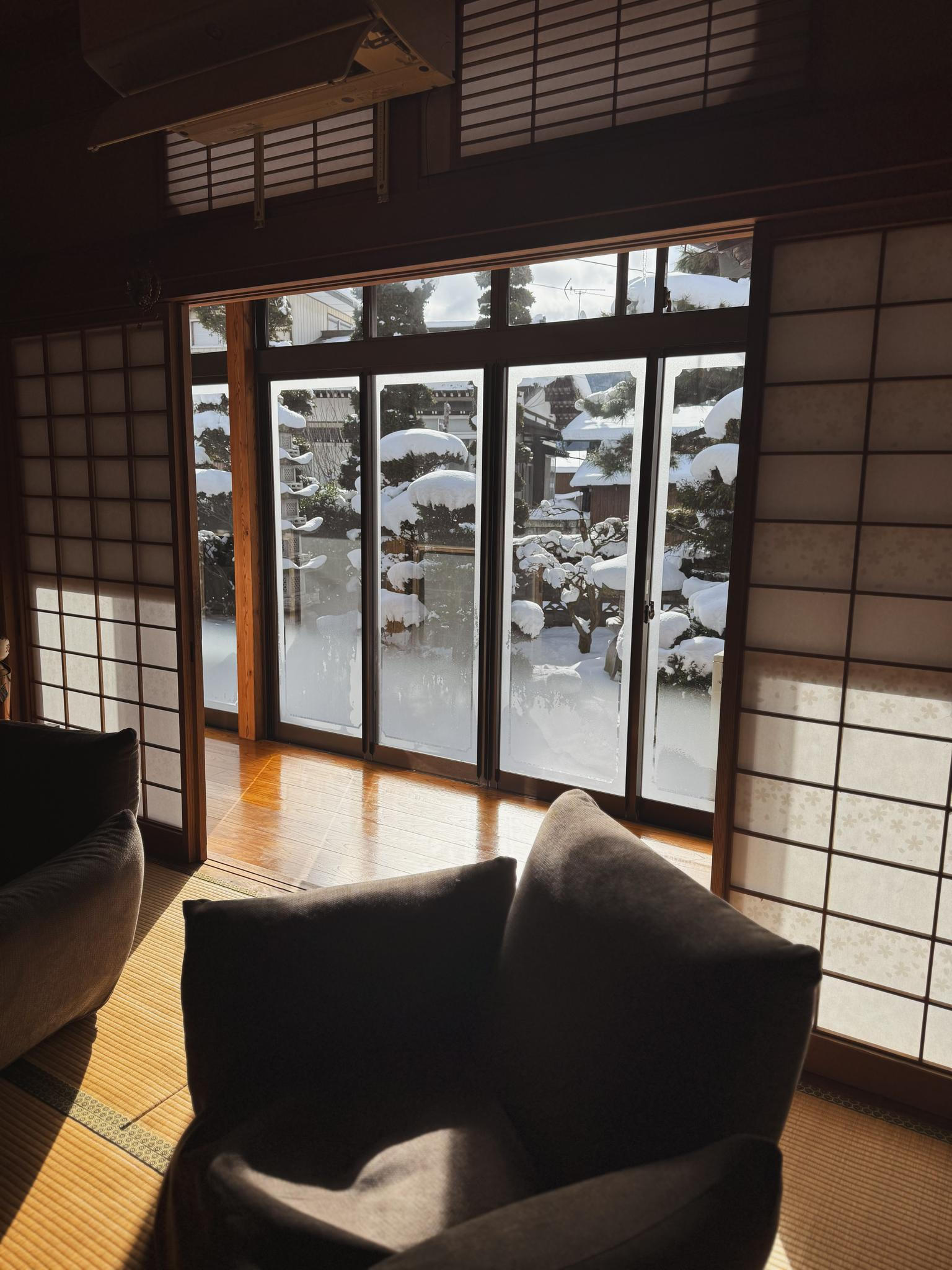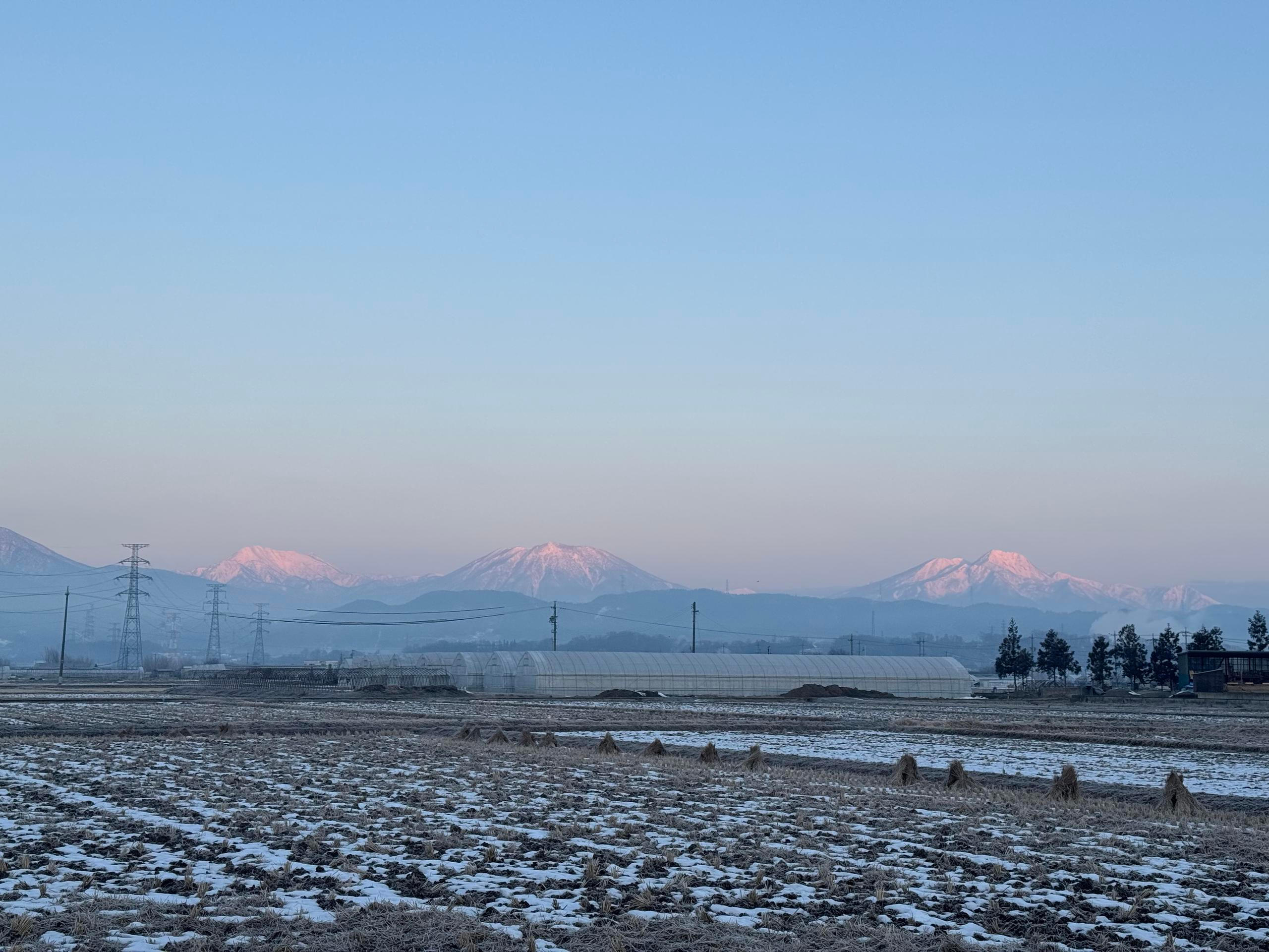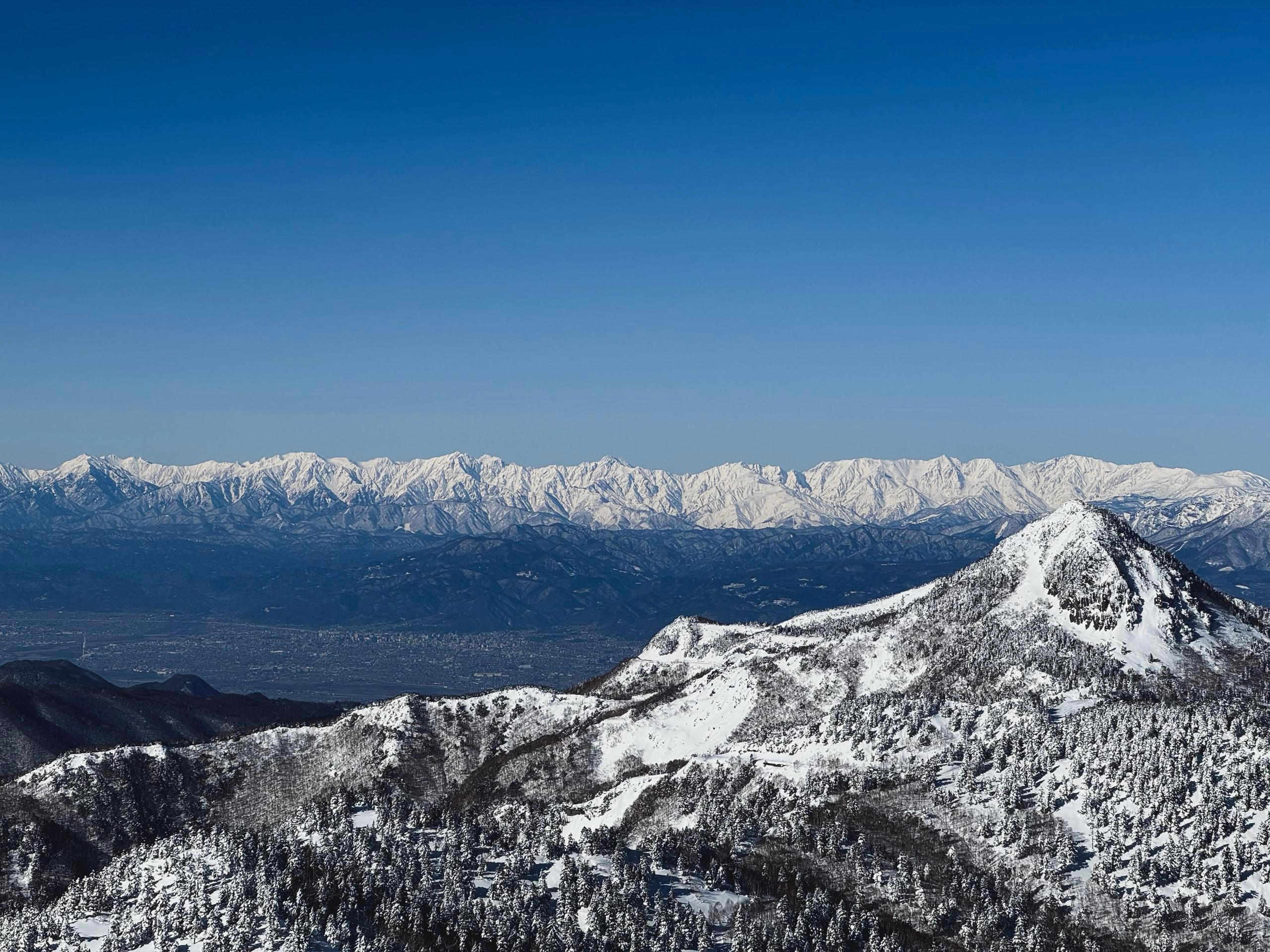 Z okna se dá pohodlně dohlédnout na vrcholky japonských Alp, které – na rozdíl od těch evropských – na první pohled nouzí o sníh netrpí.