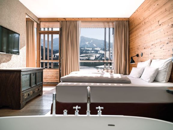 Hotel působí jako útulný boutique hotel - díky své architektuře i chytrému uspořádání budov, tzv. třítraktovému Y-půdorysu, z pokojů i zvenčí vnímáte vždy jen část hotelu, což přispívá k pocitu intimity a klidu. Interiér kombinuje přírodní materiály a moderní design: staré štýrské dřevo od Admonteru, sukno a vlna od známé textilky Steiner 1888, která obléká nejen místní horaly, ale dodává textílie i světovým módním značkám jako Jil Sander nebo Dolce & Gabana. Velká okna a světlem zalité prostory přinášejí přírodu i do interiéru - takže hory nejen vidíte, ale i cítíte a vnímáte.