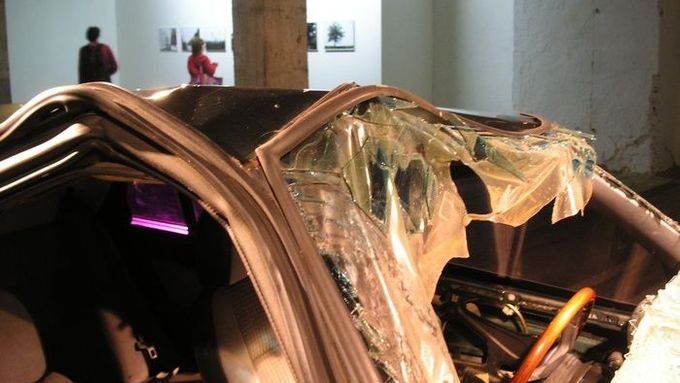 V centru galerijního prostoru je umístěn automobilový vrak po havárii. Alfa Romeo. Přední sklo roztříštěné, vylomené dveře na straně spolujezdce pootevřené, na hluboce promáčknuté a rozdrcené kapotě je patrná síla i směr nárazu.