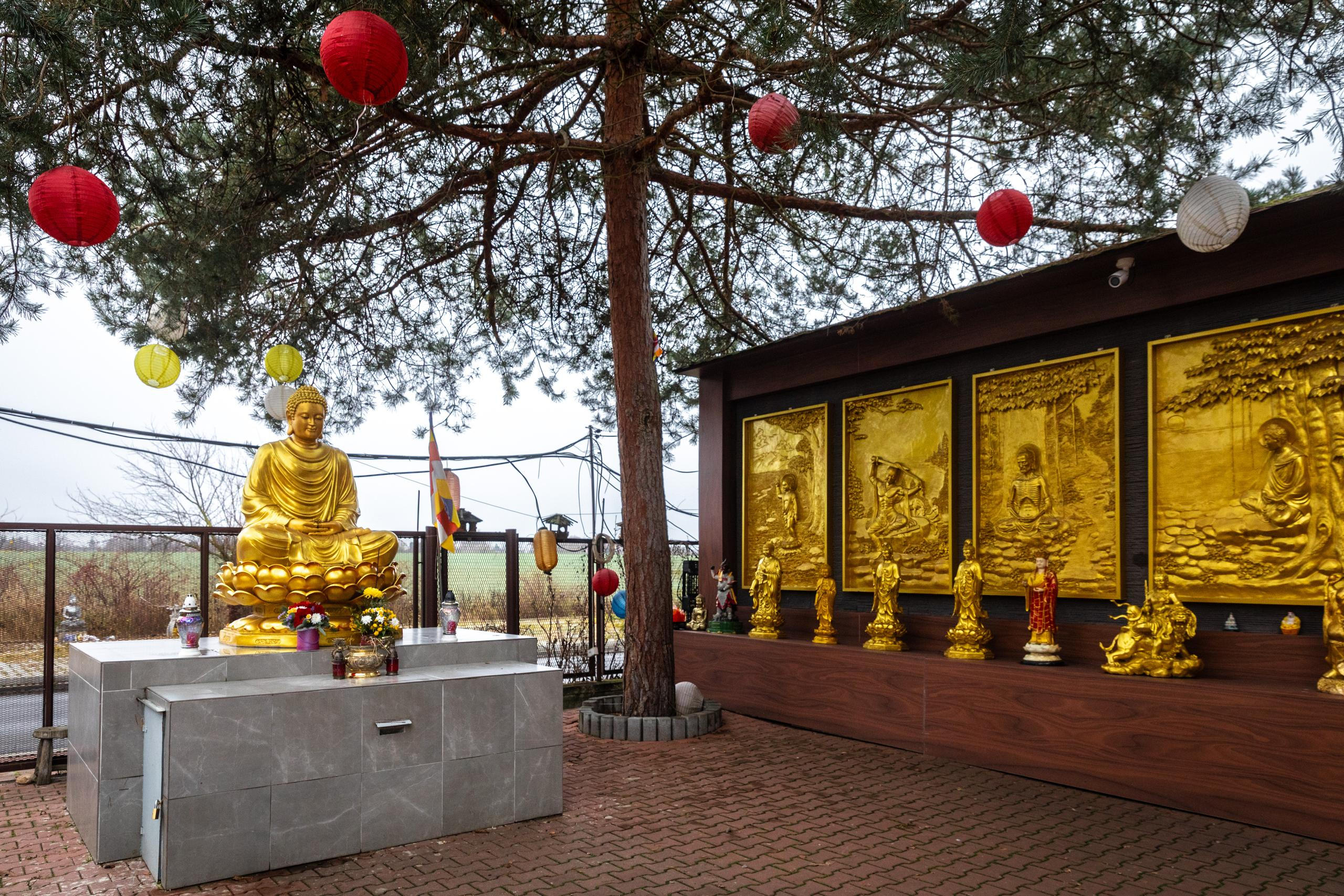 Další z dominant Sapy, o které málo kdo ví, je buddhistický chrám. Nad jeho vstupem se třepetají barevné lampiony a před ním sedí zlatá socha Buddhy.